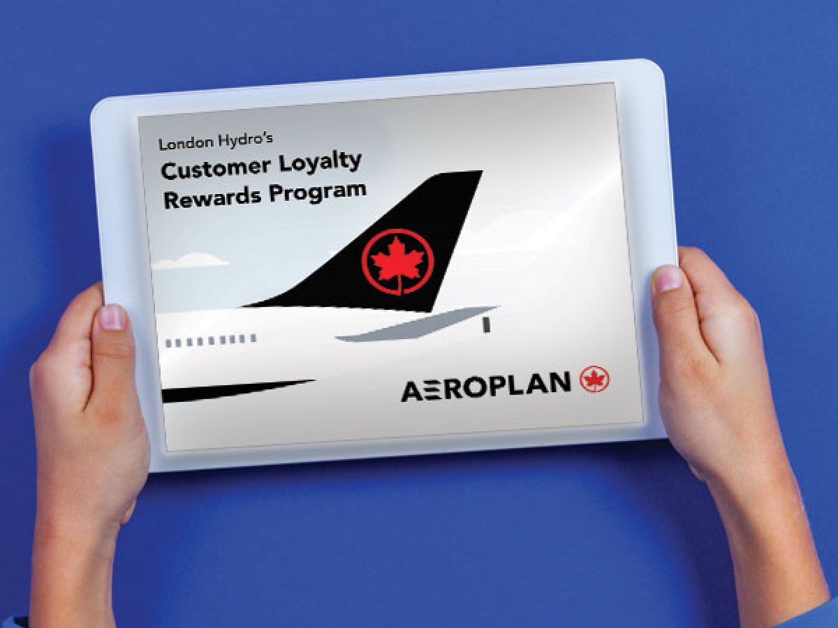 Hands holding an iPad showing the back end of an airplane promoting Aeroplan